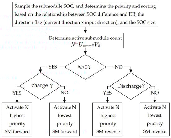 The SOC balancing control within the bridge arm is shown in Figure 11. The number of submodules to be activated N is determined by the ratio of the bridge arm voltage reference Uarmref to the battery’s rated voltage Vd. The deadband (DB) defines the permissible SOC difference between two batteries. When the SOC difference does not exceed the deadband, the batteries are sorted according to their current state. The calculation formula for Uarmref is shown in Equation (19).