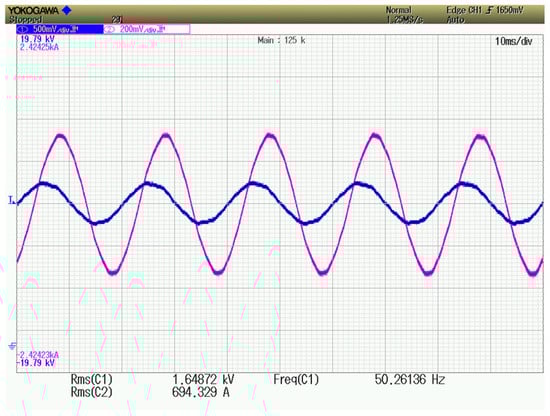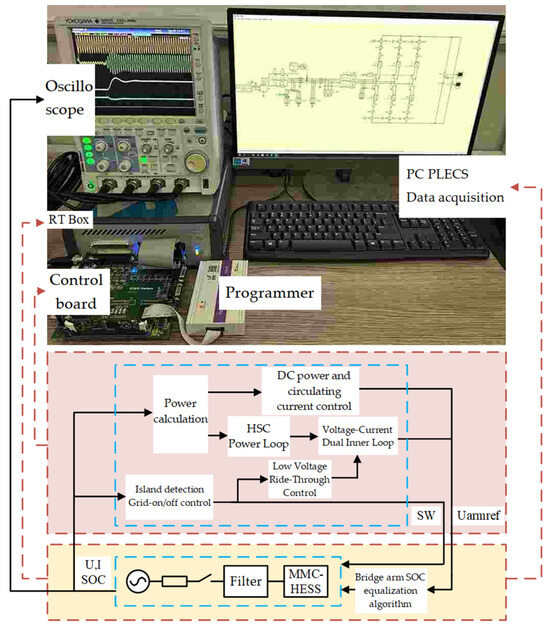 To verify the HSC-MMC-HESS topology and control strategy mentioned above, a hardware-in-the-loop experimental model was constructed based on the experimental platform shown in Figure 13; the controller model is Texas Instruments TMS320F28335. The system parameters are listed in Table 2. The voltage and current waveforms observed by the oscilloscope under normal operation are shown in Figure 14.