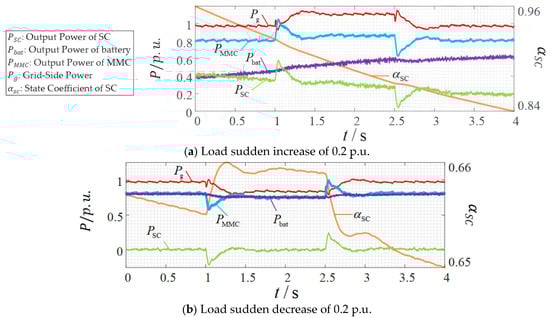 From Figure 15, it can be seen that after a load step change on the grid side, the transient change in MMC output power has inertia and damping characteristics, providing or absorbing about 0.016 p.u. of active power to or from the grid. The inertia and frequency support capability are effectively verified. From Figure 16, it can be seen that the frequency variation of the grid-side power source is reduced after connection. When the load increases by 0.2 p.u., due to the supercapacitor voltage state coefficient α > 0.75 and its discharging state, the supercapacitor takes on part of the low-frequency power component. When α > 0.95, the maximum share reaches 0.5, which is the set KL0. The power distribution strategy allows the supercapacitor to effectively handle high-frequency power components and some low-frequency power components while preventing overcharging or over-discharging, stabilizing the battery output power.