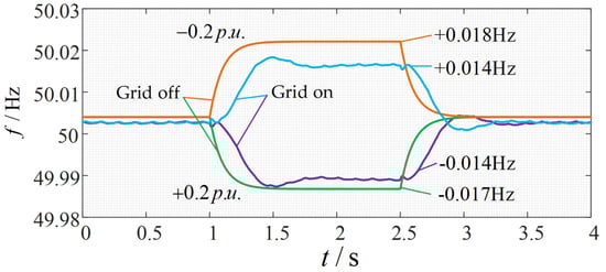To verify the inertia and frequency support capabilities of the HSC-MMC-HESS and the feasibility of the power distribution strategy between energy storage and supercapacitors, a load step change experiment was conducted on the above-mentioned experimental platform. The grid-side power source simulates a synchronous machine, where J and Dp are 50 and 500, respectively. The initial load of the grid side is 1 p.u., and it steps to 1.2 p.u. and 0.8 p.u., respectively, for 1.5 s before recovery. The MMC machine-side load is 0.8 p.u., and the power command is 0.8 p.u. Under grid-connected conditions, the output power profile during load step changes is depicted in Figure 15, while the corresponding frequency variations are shown in Figure 16. For comparison with the grid-connected scenario, the frequency response under islanded operation during the same load transient is also presented in Figure 16.
