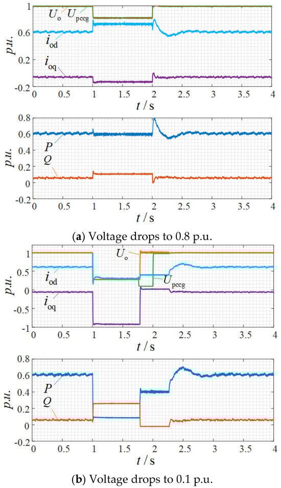 From Figure 17a, when the voltage drops to 0.8 p.u., the system switches to current control, and the current amplitude does not reach the limit of 1.2 p.u.; so, the active power remains at 0.6 p.u. After 1 s, the voltage recovers, and the system exits the current control mode. From Figure 17b, when the voltage drops to 0.1 p.u., the output is reactive current, which compensates the grid voltage to 0.28 p.u. The current amplitude reaches the limit, and the active power is constrained. According to Equation (12), the system operates in islanded mode for about 0.79 s, with an output power of 0.4 p.u. from the machine-side load. After 1 s, the voltage recovers, and the MMC continues to grid connect after pre-synchronization. Based on the results above, the system can automatically and reliably switch between low-voltage ride-through, normal grid connection, and disconnection modes.