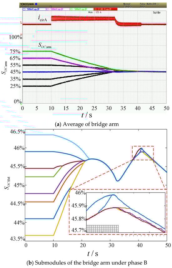 From Figure 19, it can be seen that after limiting the two components of the circulating current, the SOC balancing between phases and between the upper and lower bridge arms is achieved after approximately 23 s and 33 s post-startup, respectively. Through the intra-bridge arm submodule SOC balancing control, the SOC is maintained in a state of basic equilibrium within the deadband range.