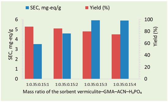 It was observed that the static ion-exchange capacity (SEC) of the vermiculite–GMA–ACN–H3PO4 adsorbent increased with the concentration of orthophosphoric acid, reaching a peak value of 5.91 mg-eq/g at 3.0 mass parts (Figure 1). Beyond this point, further increases in acid concentration did not result in a corresponding enhancement of the SEC. This saturation effect can be attributed to the exhaustion of available active sites on the sorbent surface, the structural densification of the material, the formation of polymeric phosphate layers, and potential side reactions that negatively affected the sorbent’s performance. Therefore, the optimized acid concentration was selected, which maximized the static ion-exchange capacity while preserving the sorbent’s chemical and mechanical stability.
