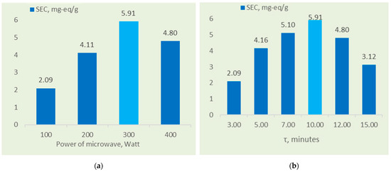 Figure 2 shows that the optimal SEC of 5.91 mg-eq/g was achieved with 10 min of microwave treatment at 300 W and 110 °C (split into two 5 min intervals with cooling breaks). Prolonged exposure or increased microwave power beyond 300 W led to a decrease in SEC.