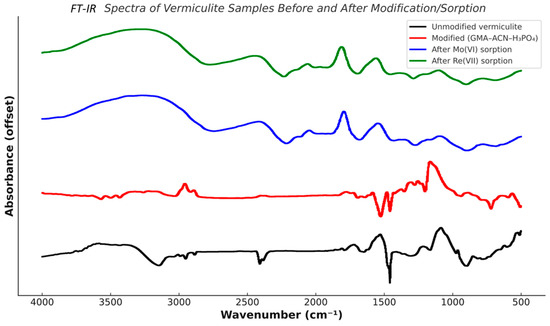The FT-IR spectra (Figure 3) of vermiculite and its modified forms confirm the structural transformation of the sorbent during modification with GMA–ACN–H3PO4 and subsequent sorption of Mo (VI) and Re (VII) ions. The spectrum of unmodified vermiculite shows characteristic bands near 3620 cm−1 (–OH stretching), 1620 cm−1 (H2O bending), 1040 cm−1 (Si–O stretching), and 780 cm−1 (Al–O bending), typical for natural layered silicates. Upon modification, new bands appear at 2335 cm−1 and 1724 cm−1, corresponding to C≡N (from acrylonitrile) and C=O (from glycidyl methacrylate), respectively. Phosphate groups are confirmed by peaks at 1298, 1223, 1173, and 1081 cm−1, indicating P=O, P–O–CH3, and P–O–C functionalities, which enable hydrogen bonding and electrostatic interactions with metal ions. After Mo (VI) sorption, the spectrum reveals intensified OH stretching (~3432 cm−1), enhanced H2O deformation (1631 cm−1), and distinct new bands at 915, 778, and 626 cm−1, associated with Mo–O bonds, confirming metal uptake. Similarly, the spectrum after Re (VII) sorption exhibits preserved OH and Si–O bands along with new absorptions at 1038 and 541 cm−1, characteristic of Re–O interactions. These spectral changes demonstrate the successful incorporation of functional groups during modification and effective complexation of Mo and Re ions through ligand exchange and hydrogen bonding.