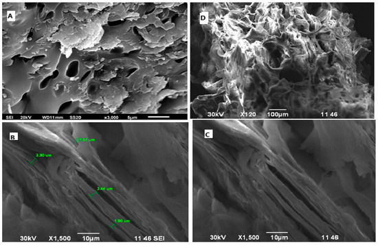 Evaluation of the structure of the sorbent vermiculite–GMA–ACN– based on SEM images. (A) Surface morphology at ×3000 magnification; (B) Fibrous structure and pore sizes at ×1500; (C) Porous network and internal structure at ×1500; (D) Macroscopic texture and agglomerates at ×120.