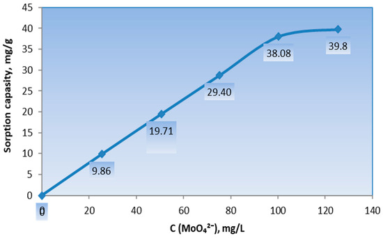 As shown in Figure 5, with an increase in the concentration of molybdenum ions (MoO42−) in an aqueous solution of Na2MoO4∙2H2O, the sorption capacity of the vermiculite–GMA–ACN–H3PO4-based sorbent increases from 9.86 mg/g to 39.8 mg/g and stabilizes at a metal concentration above 125 mg/L. Further increases in the molybdenum ion concentration in the solution do not lead to an increase in sorption capacity, indicating that the maximum sorption capacity for MoO42− ions on 0.05 g of the vermiculite–GMA–ACN–H3PO4 sorbent is 39.8 mg/g, with a extraction rate (R) of 79%.