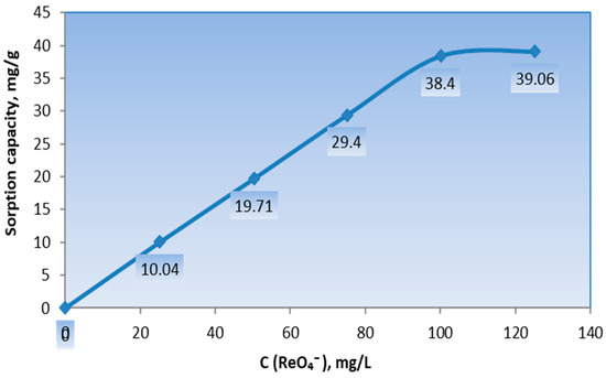 Figure 6 shows the sorption isotherms of the ReO4− ions from the NH4ReO4 salt solution using the vermiculite–GMA–ACN–H3PO4 sorbent. As the concentration of ReO4− ions in the aqueous NH4ReO4 solution increases, the sorption capacity of the sorbent rises from 10.04 mg/g to 39.06 mg/g and subsequently stabilizes. Additionally, the extraction rate (R) of the vermiculite–GMA–ACN–H3PO4 sorbent for ReO4− ions reached 78%.
