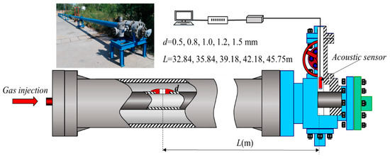 Acoustic detection technology is one of the most rapid and efficient detection methods and also one of the most extensively researched pipeline leak detection and localization techniques [8,9,10,11,12]. By detecting the leak-induced acoustic waves generated during structural leakage, leakage information can be obtained. Conventional methods such as noise logging, ultrasonic logging, and acoustic wave detection in surface pipelines are all based on this principle [13,14,15,16]. The development of leak acoustic wave detection technology in surface pipelines has reached relative maturity, and related research findings can be extended to downhole tubing leak detection. Although downhole tubing shares similarities with natural gas pipelines, such that leak acoustic waves are generated by gas jet flows inside the pipes, natural gas pipelines typically have no external structures, allowing free jet development. In contrast, downhole tubing is surrounded by casing, and the gas jet from leakage holes cannot fully develop freely due to casing constraints [17,18,19]. Additionally, factors such as tubing string vibrations during gas well production, the presence of cement sheaths outside the casing, and sea wave impacts on wellbores all increase the difficulty of acoustic wave acquisition in tubing and casing [19]. Researchers including Wang Qiong and Liu Yanjun conducted theoretical analyses and experimental studies on inner pipe leakage noise in jacketed structures. They concluded that when both the inner pipe and jacket contain gas environments, the noise primarily originates from jet noise, vortex noise, monopole sources, and gas impacts on outer pipe walls. The strongest noise occurs at leakage points and outer pipe wall boundaries. They conducted experimental detection studies using acoustic emission technology on the outer walls of casing pipes [20,21]. These findings provide foundational data for understanding downhole tubing leakage acoustic source characteristics, but none address scenarios where a leakage occurs beneath annular protective fluid, failing to achieve full-wellbore tubing leak detection at the wellhead. Therefore, the core objective of this study is to explore the feasibility of using acoustic detection technology for full-wellbore tubing leak detection at the wellhead, aiming to provide data support for improving downhole tubing leak detection technology systems.