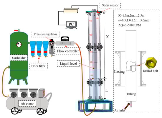 To address the aforementioned issues, the optimized tubing leakage simulation system is shown in Figure 2. First, the simulation system maintains geometric similarity with production wellbore structures: it faithfully replicates the actual dimensions of tubing and casing while adopting a vertical configuration to facilitate the creation of leakage conditions below the annular protection fluid. Second, the system achieves dynamic similarity in gas migration into the annulus: leakage gas flows upward, driven by gravity (with additional buoyancy for leaks below the liquid level) and pressure differentials, mirroring field conditions. Third, power source similarity is ensured: while production wells rely on downhole high-pressure gas reservoirs, the simulation system utilizes a pressurized gas tank as its driving source.