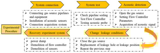 As shown in Figure 4, prior to conducting the acoustic detection experiment for tubing leakage, the following preparatory steps must be performed: First, connect all pipelines and electrical circuits of the system components. Then, systematically inspect both the sealing integrity of gas pipelines and the parameter configuration of the signal acquisition system. Particularly noteworthy, since the research focuses on leakage acoustic signals, it is imperative to ensure hermetic sealing at all gas pipeline connections to minimize interference from extraneous leakage noise on experimental results. Upon confirming proper connection and normal functionality of all systems, activate the air pump to pressurize the buffer tank to its rated pressure of 0.7 MPa, then deactivate the pump to maintain a silent operational state.
