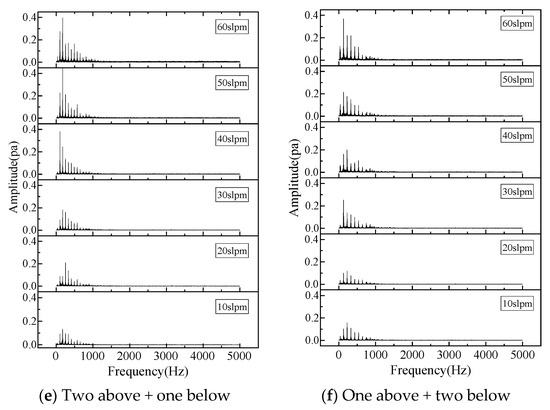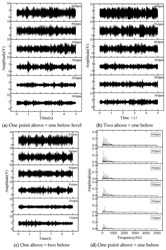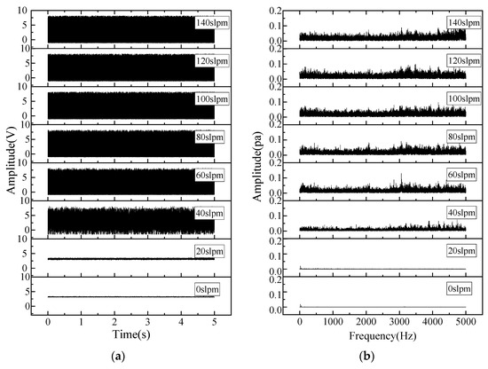 Taking a 2 mm leakage aperture as an example, Figure 5 demonstrates the time–frequency characteristics of leakage noise when the leakage flow rate is controlled within the 0–140 SLPM range (all time–domain signals use a 5 s time window, and the frequency–domain signals are obtained through Fast Fourier Transform (FFT) processing of the time–domain signals. The same applies hereinafter). The figure reveals two key observations: (1) The amplitude of leakage noise energy increases with higher flow rates, and (2) the broadband noise exhibits progressively stronger high-frequency components at elevated flow rates.