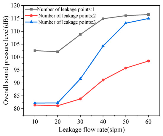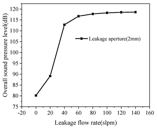 According to established noise spectrum calculation methods [24,25], under constant aperture conditions, the peak value of the noise spectrum shows direct proportionality to the leakage rate. Figure 6 presents the corresponding curve of total sound pressure level (SPL) versus flow-rate variation, showing that while the overall SPL increases with flow rate, its growth rate significantly decelerates beyond certain flow rates. This phenomenon stems from two physical mechanisms: First, the relationship between total SPL and leakage flow rate is inherently nonlinear. Second, given fixed pressure differentials, a 2 mm aperture has a maximum achievable flow capacity—beyond this threshold, the gas flow controller loses regulation capability.