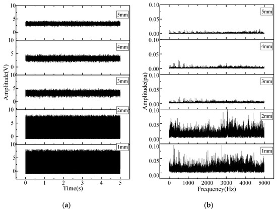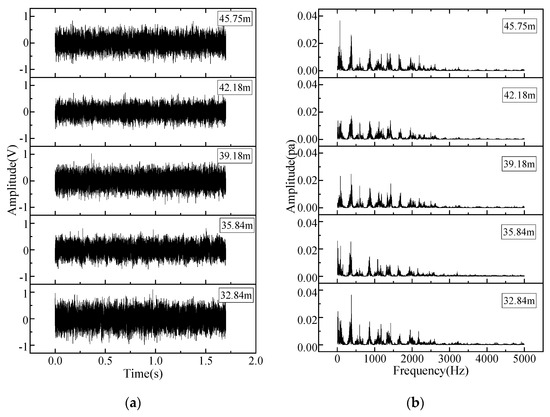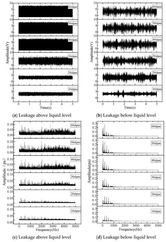 Combining the time–domain diagrams of leakage noise when the leakage position is above or below the liquid level (Figure 13b and Figure 14), it can be observed that when the leakage point is below the liquid level, the leakage acoustic signal exhibits pulsating impact characteristics in the time domain.