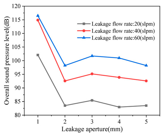 Cross-referencing with Figure 5, it can be seen that lower leakage flow rates correspond to reduced leakage noise energy. The corresponding curve of total sound pressure level (SPL) versus aperture size is shown in Figure 8. At the same leakage flow rate, the total SPL of leakage noise generally decreases as the aperture size increases.