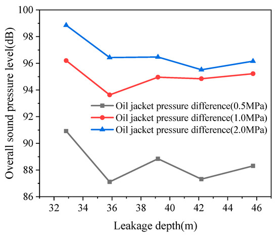 The corresponding curve of total sound pressure level (SPL) versus leakage depth is shown in Figure 10. Under constant casing–tubing pressure differentials, the total SPL of leakage noise generally decreases with increasing aperture size. Additionally, the SPL diminishes as the monitoring point moves farther from the leakage location.