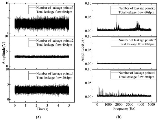 (a) Time-domain characteristics under different leakage flow rates, (b) Frequency-domain characteristics under different leakage flow rates.