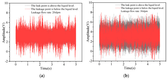 Time–domain diagrams of leakage noise for above-surface and sub-surface leakage positions: (a) Leakage Flow Rate at 20 slpm, (b) Leakage Flow Rate at 30 slpm.