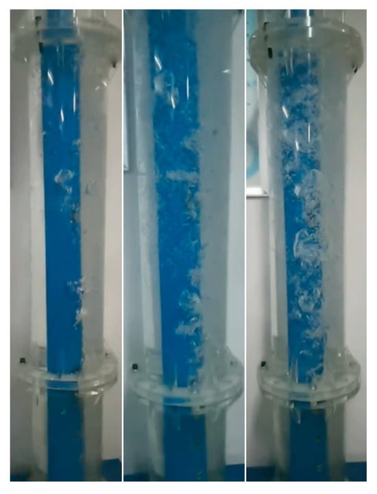 Cross-referencing with Figure 15, showing the motion trajectory of leakage gas in liquid when the leakage point is below the liquid level, reveals the gas movement after leaving the leakage orifice displays discontinuous patterns. At lower flow rates, the detected acoustic signals primarily originate from bubble bursting sounds as gas reaches the liquid surface and surface disturbance noises. As the flow rate increases, some leakage gas penetrates through the liquid and impacts the casing well, adding new components to the detected acoustic signals in the annulus.