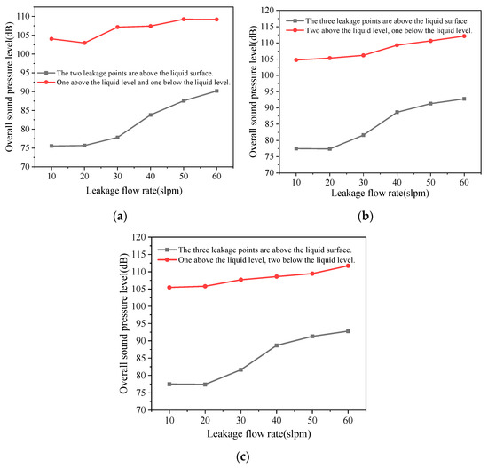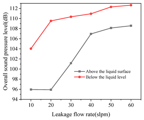 The corresponding SPL-versus-flow-rate curves for both leakage positions are presented in Figure 16, revealing two key observations: (1) At identical flow rates, below-liquid leaks produce 3–5 dB higher noise levels in annular measurements compared to above-liquid scenarios; (2) Both configurations exhibit monotonically increasing total SPL with higher leakage flow rates, though the below-liquid condition maintains consistent amplitude superiority across the entire 0–60 SLPM test range.
