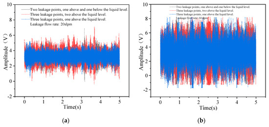 Time–domain diagrams of leakage noise under simultaneous above- and sub-surface leakage conditions: (a) Leakage Flow Rate at 20 slpm, (b) Leakage Flow Rate at 60 slpm.