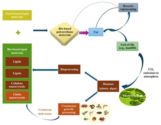 PUs can be produced from a stoichiometrically balanced blend of polyols and isocyanates. These chemicals are typically produced from fossil-based resources (crude oil), significantly impacting the natural ecosystem and human health. For example, isocyanates and their precursors are highly toxic, mutagenic, and carcinogenic [9]. Due to concerns related to the depletion of fossil resources and climate change impacts, more attention has been paid to novel PU foam production pathways that use renewable, low-carbon raw materials [1]. Renewable polyols are derived from plant oils, sugars, and lignocellulosic biomass [10]. In addition, the development of non-isocyanate polyurethanes (NIPUs) has further advanced the sustainability of PU materials by eliminating the use of toxic isocyanates. Instead, NIPUs are synthesized through the reaction of cyclic carbonates and amines [11,12,13]. These innovations highlight the growing potential for bio-based PUs to replace traditional synthetic PUs in various applications, thereby supporting a more sustainable and circular economy (Figure 1).