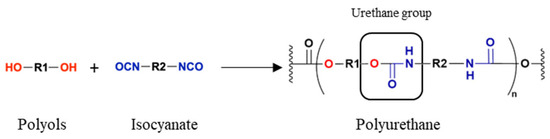 The synthesis of PUs builds a urethane network via an addition reaction between hydroxyl groups of polyols and isocyanate groups, as shown in Figure 2. In this reaction, the nucleophilic –OH group of the polyol reacts with the electrophilic –NCO group of the isocyanate to form a urethane bond (–NH–CO–O–), enabling linear or crosslinked polymer structures depending on the functionality of the monomers. PU foams are produced by reacting the pre-mixed mixtures, blended polyols, surfactants, catalysts, and blowing agents with subsequently introduced isocyanates. The polyol influences the technical performance and characteristics of PU. For instance, polyols with high functionality and aromatic groups generally form rigid PU structures due to high crosslinking, while ones with low functionality and linear structures can result in more flexible foams [10]. Diverse bioresources have been used as polyols for PU production. Given the complexity and heterogeneity of the composition and chemical structure of bioresources, it is important to understand their properties, such as the reactivity of each hydroxyl group. The reactivity of the primary hydroxyl group of polyols is higher than that of the secondary and tertiary ones. Also, the phenolic hydroxyl group of polyols shows lower reactivity than these aliphatic hydroxyl groups, possibly due to the steric hindrance effects [28,29].