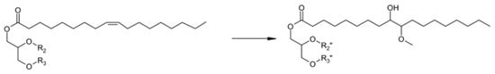 Epoxidation followed by oxirane ring-opening (methanol, as an example) to derive polyol from vegetable oil (revised from [67]).