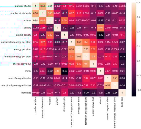 Feature engineering is a crucial step in the development of machine learning models, enabling the extraction of generalizable and representative features that enhance the model’s generalization ability [18]. Proper feature selection can prevent overfitting and enhance the robustness and stability of the model. It should be noted that, due to the focus of this study being on a specific material system, feature selection was primarily based on physical interpretability rather than correlations among features, which deviates from mainstream feature-selection approaches. The initial silicon oxide material database contained numerous non-numeric columns with the data type “Object”. We attempted to re-encode these features, but found that doing so would lead to a significant increase in feature dimensionality and introduce noise; therefore, these features were removed (a total of 48). The ‘equilibrium reaction energy per atom’ feature was also removed due to its messy data type and numerous missing values. Columns such as ‘is gap direct’, ‘is magnetic’, and ‘is metal’ were re-encoded into numeric types and included in model training; however, they did not improve performance and were thus removed. Additionally, the ‘deprecated ‘ and ‘deprecation reasons’ features, which are irrelevant to model training, were also deleted. Pearson correlation coefficients were calculated for the remaining 13 features [19], and a heatmap of these coefficients was generated to illustrate the correlations between various features, as shown in Figure 2. This approach aims to precisely identify the key features affecting the performance of materials used in electric arc furnace smelting.