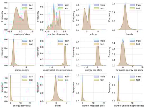 To ensure the objectivity and accuracy of model evaluation, we randomly divided the entire dataset into a training set and a test set at a ratio of 80% to 20%. The training set contains 4232 samples of silicon oxide materials, which were used for model training and optimization; the test set, comprising 1058 samples, was retained as the final test set for independently evaluating the model’s performance. Kernel density estimation plots were generated for both the training and test sets, as shown in Figure 3. The feature distributions of the training and test sets are roughly similar, indicating that the model’s training performance will not be affected by data distribution differences.