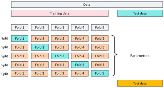 Cross-validation [21] is a statistical method used to assess generalization ability by repeatedly dividing the dataset and validating the model. The core idea is to systematically partition the dataset to evaluate the model’s generalization capability, with the primary goal of preventing overfitting and enhancing the predictive reliability on unseen data. During the hyperparameter optimization phase, five-fold cross-validation was used to adjust the hyperparameters of each model. Figure 4 illustrates the concept of five-fold cross-validation. The training set was evenly divided into five subsets, with one subset held out as a validation set each time while the remaining four were used for model training. Through this process, we evaluated and selected the best hyperparameter combinations. The average of the five validation results was used to reflect the overall performance of the model. It is particularly emphasized that the final reserved test set was not used during the entire hyperparameter optimization process, ensuring objectivity and independence in assessing model performance. By using five-fold cross-validation, we can obtain a robust estimate of model performance, effectively reducing the accidental effects caused by specific data-splitting methods, ensuring that the selected optimal parameters have broad applicability and reliability, and are insensitive to the foldings used in hyperparameter optimization.