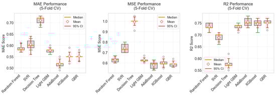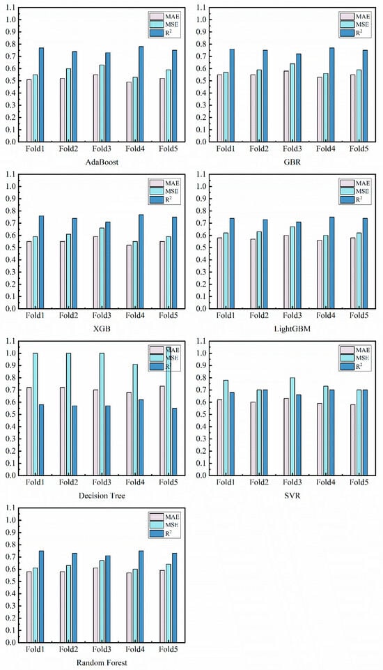 To effectively reduce the model training bias caused by random sampling of the training dataset, a five-fold cross-validation method was used to comprehensively evaluate the model’s performance. Figure 5 shows the cross-validation results of the trained machine learning models, including three error metrics: R2, MAE, and MSE. Figure 6 shows a box-and-line plot based on the cross-validation results of the machine learning model. Table 4 presents the average statistical results from the cross-validation. The cross-validation results indicate that the performance deviation in each fold is very limited, suggesting that the models are relatively stable.