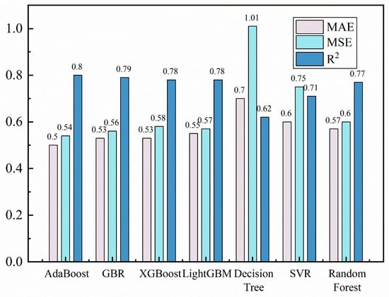 To evaluate the reliability of the models, their performance was tested using a test set. Figure 7 compares the performance of different models under their optimal hyperparameters. The results indicate that AdaBoost performed notably well, achieving the highest R2 (0.80) and the lowest MAE (0.5), with the smallest deviation between predicted and actual values, explaining 80% of the data variance. This finding suggests that during the practical material screening process, the AdaBoost model can rapidly predict the bandgap of numerous silicon oxide materials with high accuracy, assisting researchers in quickly identifying materials with potential application value, thereby significantly reducing the workload and costs associated with experimental verification. The decision tree model had the lowest R2 at only 0.62, indicating severe overfitting. AdaBoost, GBR, XGBoost, and LightGBM, which showed better prediction performance, are all ensemble models, demonstrating the effectiveness of ensemble learning in predicting the performance of complex materials. The strength of these models is not only reflected in their data processing capabilities but, more importantly, in their ability to quickly uncover associations between structural features and performance when dealing with complex material systems, providing guidance for the design of new materials.