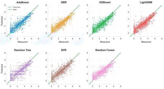 Comparison of predicted and true values of seven machine learning methods on training and test sets. The green line in the subplot is the ideal reference line, which indicates that the predicted value is exactly the same as the actual value and is used as a benchmark comparison; the line in the subplot with the same color as the scatter point is the regression trend line, which indicates the overall trend between the predicted value and the actual value.
