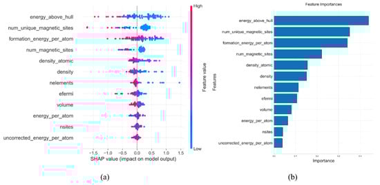 In machine learning models, SHAP values are used to explain the contribution of each feature to the prediction outcome. Figure 9a illustrates the contribution of various features to the model’s prediction results during the training of the AdaBoost model. The horizontal axis represents SHAP values, indicating the contribution of each feature to the prediction outcome. Positive values indicate a positive contribution when the feature value is high, while negative values indicate a negative contribution when the feature value is low. As shown in the figure, ‘energy above hull’ is the feature most closely related to the material bandgap. From the overall SHAP feature plot, it can be seen that there is a negative correlation between ‘energy above hull’ and the material bandgap; the smaller its value, the larger the material’s bandgap may be. Figure 9b is a feature importance plot used to assess the overall influence of features within the model. It can be seen from the plot that ‘energy above hull’ has the strongest overall influence in the model, with a feature importance value as high as 0.45.