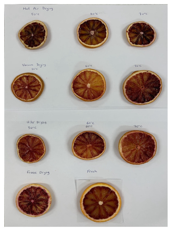 Fresh and dried blood oranges with HAD, VD, UAVD, and FD at 50, 60, and 70 °C.