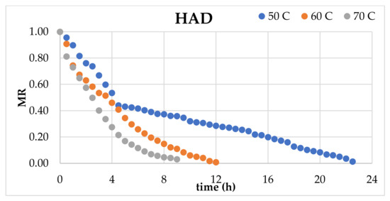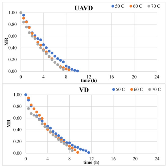 Moisture ratio (MR) vs. time (h).