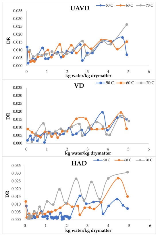 The drying of various foods under constant conditions typically results in curves with distinct shapes during the falling rate period [47]. Damage to the cell structure of foods may result in deviations during the constant drying rate period [12]. Ultrasonic treatment enhances the drying rate by leveraging the beneficial impacts of heating through attenuation and adsorption in conjunction with the mechanical effects of pressure waves [12,14,15]. Table 3 indicates that the drying rate values for the HAD, VD, and UAVD methods varied with drying temperature. The drying rate values obtained through the UAVD method, as presented in Table 3, exceeded those of the HAD and VD methods during the falling rate period, attributable to the beneficial effects of ultrasound. The drying rate values escalated with all drying techniques as the temperature increased. A shortened period is essential for the material to attain equilibrium moisture content. Figure 3 illustrates the drying rate vs. kg water/kg dry matter.