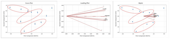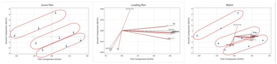 Figure 4 shows that the implementation of PCA could be an intriguing solution for a more comprehensive understanding of the interactions between kinetic parameters (drying time, DR, and Deff), energy consumption, and phytochemical quality (TPC, DPPH, ABTS, Vitamin C, Ferulic acid, Catechin, Hesperidin) and color parameters (L, a, and b) of blood orange slices that have been dried using the three processes (HAD, VD, and UAVD) at 50, 60, and 70 °C. The first two principal components (PC1 and PC2) accounted for 78.3% of the total variability in the studied parameters: PC1 of the PCA accounted for 61.6% of the variance and was expressed mainly by TPC (0.323), DPPH (0.326), ABTS (0.311), vitamin C (0.304), ferulic acid (0.332), catechin (0.308), hesperidin (0.334), and color parameters (L (0.279), a (0.296) and b (0.323)), which had good correlations among them. PC2, which accounted for 28.2% of the variance, is exclusively represented by drying time (0.468), DR (0.483), Deff (0.443), and total energy consumption (TEC) (0.458). The score plot clearly illustrates the clustering of samples according to their similarities.