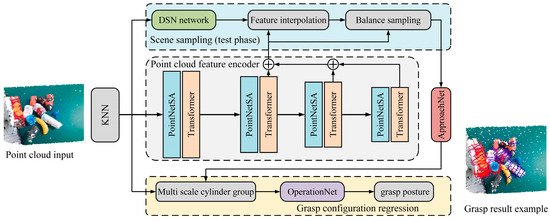 - The improved grasp detection model reconstructs the scene point cloud using RGB and depth maps. After scene segmentation, cylindrical feature sampling, and point cloud feature extraction, it predicts all graspable poses in the scene.