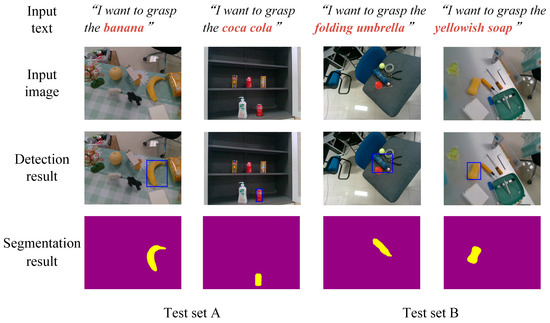 - The improved visual language model uses RGB images and text as inputs to locate the position of the target object. The multi-head attention mechanism introduced in the model can improve the stability of model training and enhance the model’s feature extraction ability. The improved visual language model can predict segmentation masks and object detection images to guide the subsequent model’s grasp posture selection.