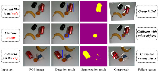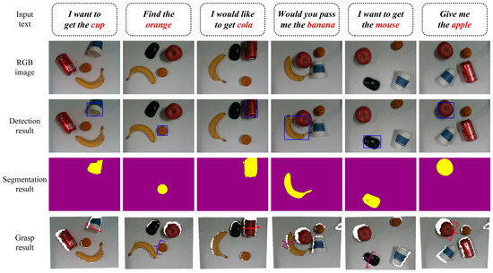 - Chen, Y.; Xu, R.; Lin, Y.; Vela, p. A joint network for grasp detection conditioned on natural language commands. In Proceedings of the 2021 IEEE International Conference on Robotics and Automation (ICRA), Xi’an, China, 30 May–5 June 2021; pp. 4576–4582. [Google Scholar]