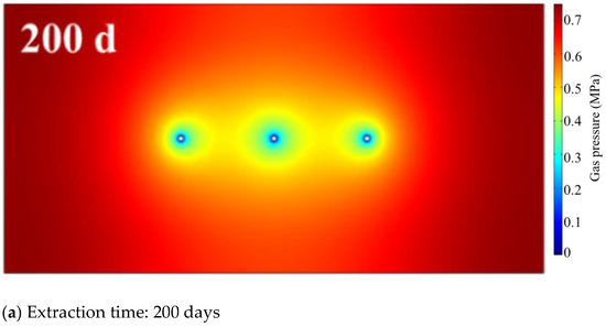 The simulation results indicate that when the pre-extraction duration reaches 200 d, the compliance zones formed by individual boreholes exhibit independent circular distribution patterns, with no effective gas field superposition effects observed between adjacent boreholes (Figure 3a). As the extraction duration extends to 300 d, the diameter of compliance zones around each borehole significantly increases to 4.5~4.8 m, demonstrating initial regional connectivity (Figure 3b). Upon achieving a 400-daypre-extraction period, adjacent compliance zones completely interconnect to form continuous strips, establishing superposition effects between neighboring boreholes (Figure 3c). This spatiotemporal evolution reveals that the expansion of gas extraction compliance zones follows a three-phase development pattern under fixed engineering parameters: “independent development–peripheral contact–complete connectivity”. The temporal–spatial continuity of coal seam gas desorption–seepage processes enhances significantly with prolonged extraction durations, particularly when exceeding 300 d, where superposition effects become dominant in governing the expansion patterns of extraction zones.