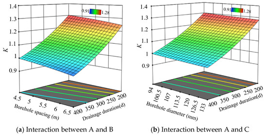The evolution pattern of K does not result from independent action of single factors but rather manifests as a comprehensive outcome of multifactor coupling effects. This study constructed a three-dimensional K response surface (Figure 5) using Design-Expert 11 software, which visually characterizes the pairwise interaction effects among four parameters—extraction duration, borehole spacing, borehole diameter, and extraction negative pressure—on K variations.
