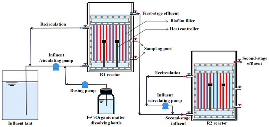 Two identical upflow biofilm reactors were used in this study to form a two-stage anammox system. The schematic diagram of the experimental setup is shown in Figure 1. Both anammox reactors (R1 and R2) were constructed from transparent acrylic plexiglass, with internal dimensions of 30 cm in length and width and 70 cm in height. The working water height was maintained at 60 cm, resulting in an effective volume of 54 L. Each reactor was filled with evenly distributed fiber-type carriers to provide support for biofilm attachment. To maintain optimal conditions for AnAOB growth, water temperature was controlled at 31.0 ± 2.0 °C using thermostatic heating rods. In addition, to prevent the growth of phototrophic bacteria capable of oxygen generation, the reactors and the influent storage bottles for Fe2+ and organic substrates were wrapped with black shading plastic film to block light exposure. During operation, the effluent from R1 was fed directly into R2 in a sequential mode using a gravity-driven flow setup, utilizing the height difference between reactors. The influent flow rate for both reactors was precisely regulated using peristaltic pumps. The hydraulic retention time (HRT) was controlled at 5.8 h during the whole experiment.