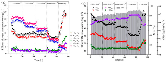 Operational performance of two-stage anammox reactors under different organic concentrations: (a) effluent nitrogen concentration of R1 and R2; (b) effluent TN, NRE, and NRRs of R1 and R2.