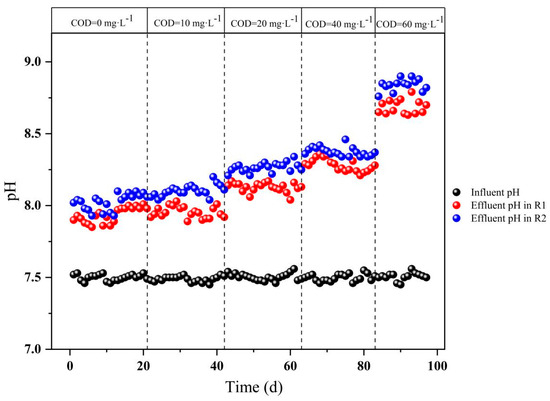 The variations in pH within the two-stage anammox reactors under different organic substrate concentrations are shown in Figure 3. The influent pH remained relatively stable in the range of 7.40–7.60 throughout the experiment. With an increasing influent COD concentration, the effluent pH values of both R1 and R2 exhibited an upward trend, which can be attributed to the combined effects of the anammox process performed by AnAOB and the denitrification carried out by heterotrophic bacteria. The average effluent pH of R1 and R2 increased from 7.92 and 8.02 (without organic addition) to 8.28 and 8.38 at a COD of 40 mg/L, respectively. At this concentration, the pH of the R1 effluent still fell within the optimal pH range for AnAOB growth (6.70–8.30); however, after undergoing further anammox reaction and alkalinity production in R2, the effluent pH exceeded 8.30. The combined impact of pH and nitrite stress exerted a synergistically inhibitory effect on anammox activity, accompanied with complete inhibition, which occurred under both acidic (pH 6.7) and alkaline (pH 8.5) conditions, and restoration, which occurred upon readjustment to the optimal pH range of 7.5 ± 0.2 [22]. It has been reported that the general enrichment range of AnAOB is between pH 6.50–8.50 [23], with optimal growth occurring at pH 6.50–9.00 [24]. Therefore, the optimal pH range may vary across different anammox systems. In the two-stage anammox system used in this study, the relatively low influent substrate concentration may allow pH to influence the concentrations of free ammonia (FA) and free nitrous acid (FNA). A moderately elevated pH helps regulate FA and FNA levels within a range suitable for AnAOB growth, suggesting that AnAOB in this system may possess a higher pH tolerance. This explains why the anammox performance in R1 was enhanced at 40 mg/L COD and why the highest NRE was observed after two-stage treatment. However, when the COD concentration was further increased to 60 mg/L, the pH in both reactors rose sharply, with the average effluent pH values of R1 and R2 reaching 8.69 and 8.84, respectively, which far exceeded the optimal range for AnAOB growth and consequently resulted in the significant inhibition of the anammox process.