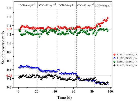 The changes in stoichiometric ratios in the two-stage anammox reactors under different organic substrate concentrations are shown in Figure 4. In R1, the ΔNO2−-N/ΔNH4+-N ratio under COD concentrations of 10, 20, and 40 mg/L was close to the theoretical value of 1.32, indicating that the anammox process was not significantly affected within this COD range. However, when the COD concentration was increased to 60 mg/L, the ΔNO2−-N/ΔNH4+-N ratio gradually increased from 1.37 to 1.57. This could be attributed to the excessive organic substrate promoting the proliferation of denitrifying bacteria in R1, which competed with AnAOB for NO2−-N, resulting in greater NO2−-N consumption than theoretically expected. In addition, under the condition without COD addition, the average ΔNO3−-N/ΔNH4+-N ratio in R1 was 0.45, significantly higher than the theoretical value of 0.26. This may have been caused by relatively high DO levels in the influent, leading to elevated NO3−-N concentrations in the effluent. As the COD concentration increased, the average ΔNO3−-N/ΔNH4+-N ratio in R1 gradually decreased, reaching 0.09 at a COD of 60 mg/L, likely due to enhanced heterotrophic denitrification that consumed NO3−-N as an electron acceptor in the presence of organic carbon. In R2, the ΔNO2−-N/ΔNH4+-N ratio remained relatively stable at approximately 1.26, slightly below the theoretical value, and was not significantly influenced by the increase in influent COD, indicating the good stability and shock resistance of the R2 reactor. Furthermore, the ΔNO3−-N/ΔNH4+-N ratio in R2 under 10 mg/L COD and under conditions without COD addition was similar and fluctuated around the theoretical value of 0.26. However, as the COD concentration increased, the average ΔNO3−-N/ΔNH4+-N ratio in R2 decreased to 0.10 at 60 mg/L COD. This suggests that while 10 mg/L COD had no significant impact on R2, the residual COD from R1 at higher concentrations entered R2 and stimulated the growth of denitrifying bacteria, thereby enhancing denitrification and resulting in lower NO3−-N production compared to theoretical expectations.