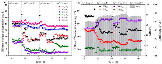 Operational performance of two-stage anammox under different Fe2+ concentrations: (a) effluent nitrogen concentration of R1 and R2; (b) effluent TN, NRE, and NRRs of R1 and R2.