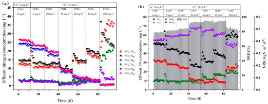Operational performance of two-stage anammox under Fe2+ coupled with organic matter: (a) effluent nitrogen concentration of R1 and R2; (b) effluent TN, NRE, and NRRs of R1 and R2.
